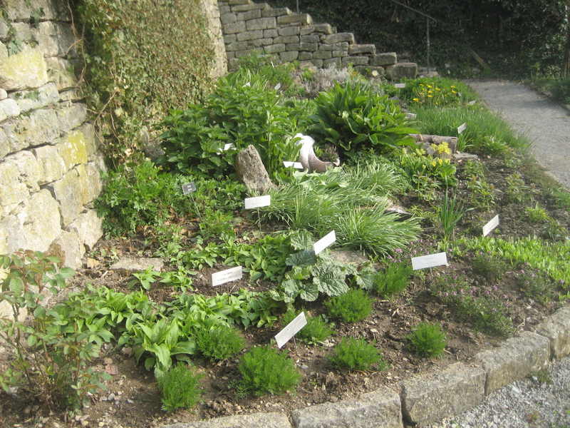 einjährigen und zweijährigen Kräuter und die mit zwei Steinlagen leicht ansteigend terrassierten Winkel zum Treppenaufgang. Hier finden wärmeliebende halbstrauchige Kräuter wie Lavendel, Salbei,